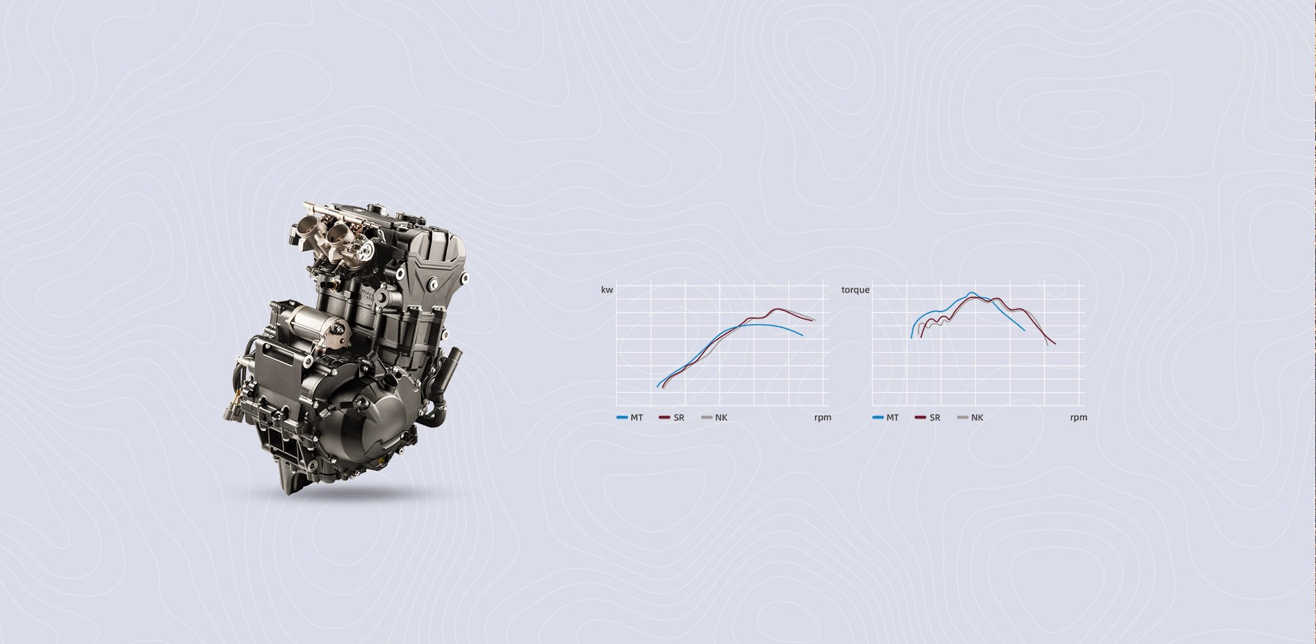 Mid-Size Parallel-Twin EngineAt the heart of the 450MT lies a refined 449cc DOHC parallel-twin with a 270° crankshaft and double balance shafts. Revised camshafts, intake/exhaust tuning, and ignition angle optimization have enhanced low-range torque, ensuring rapid initial response and consistent power delivery from 5500rpm to 7200rpm. Riders benefit from a smoother, more capable machine, whether navigating loose gravel or cruising on asphalt.